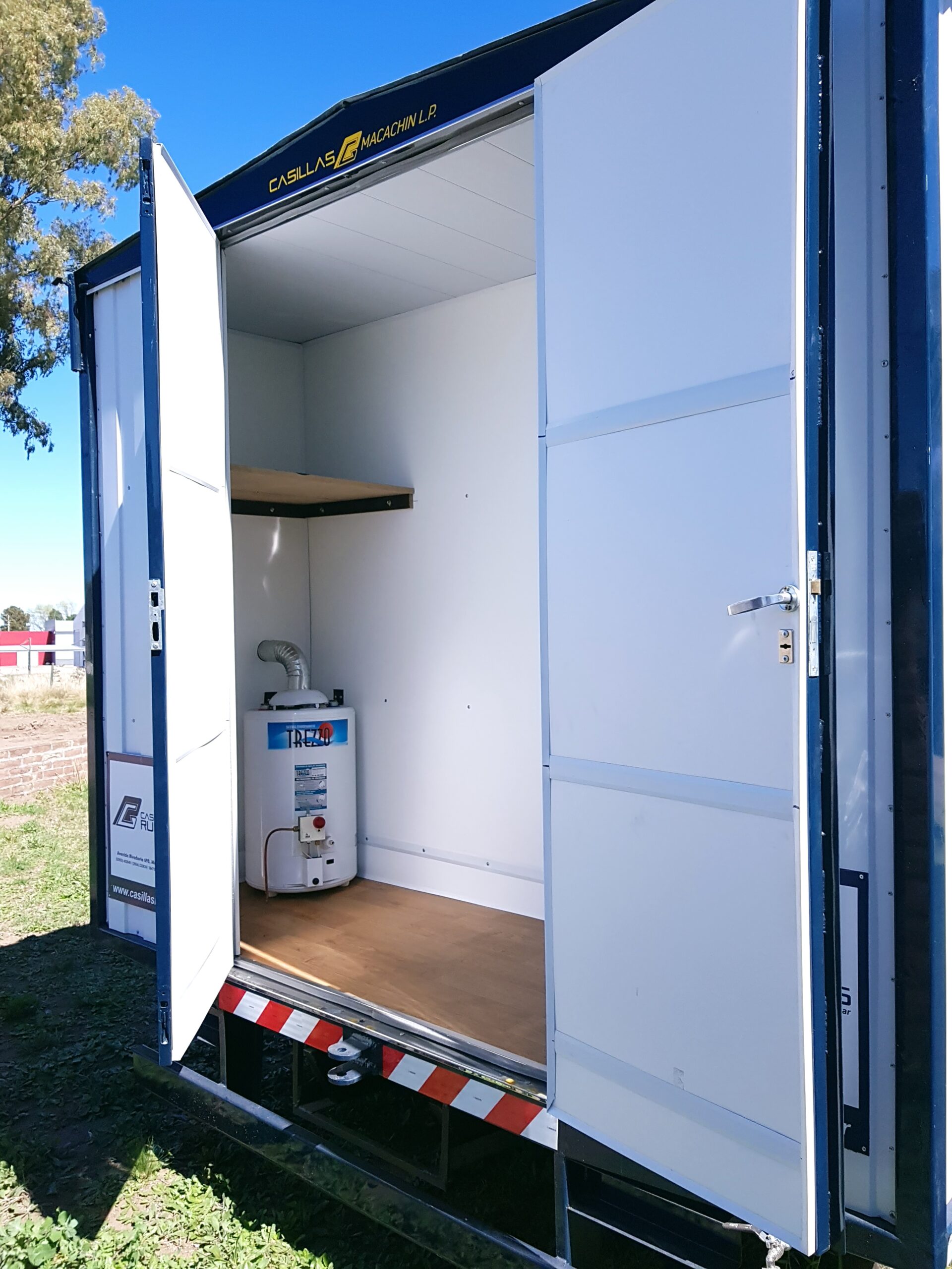 - Interior: Piso de MDF 20 mm con alfombra vinílica de alto tránsito. Revestimiento en PVC 100 % ignífugo.